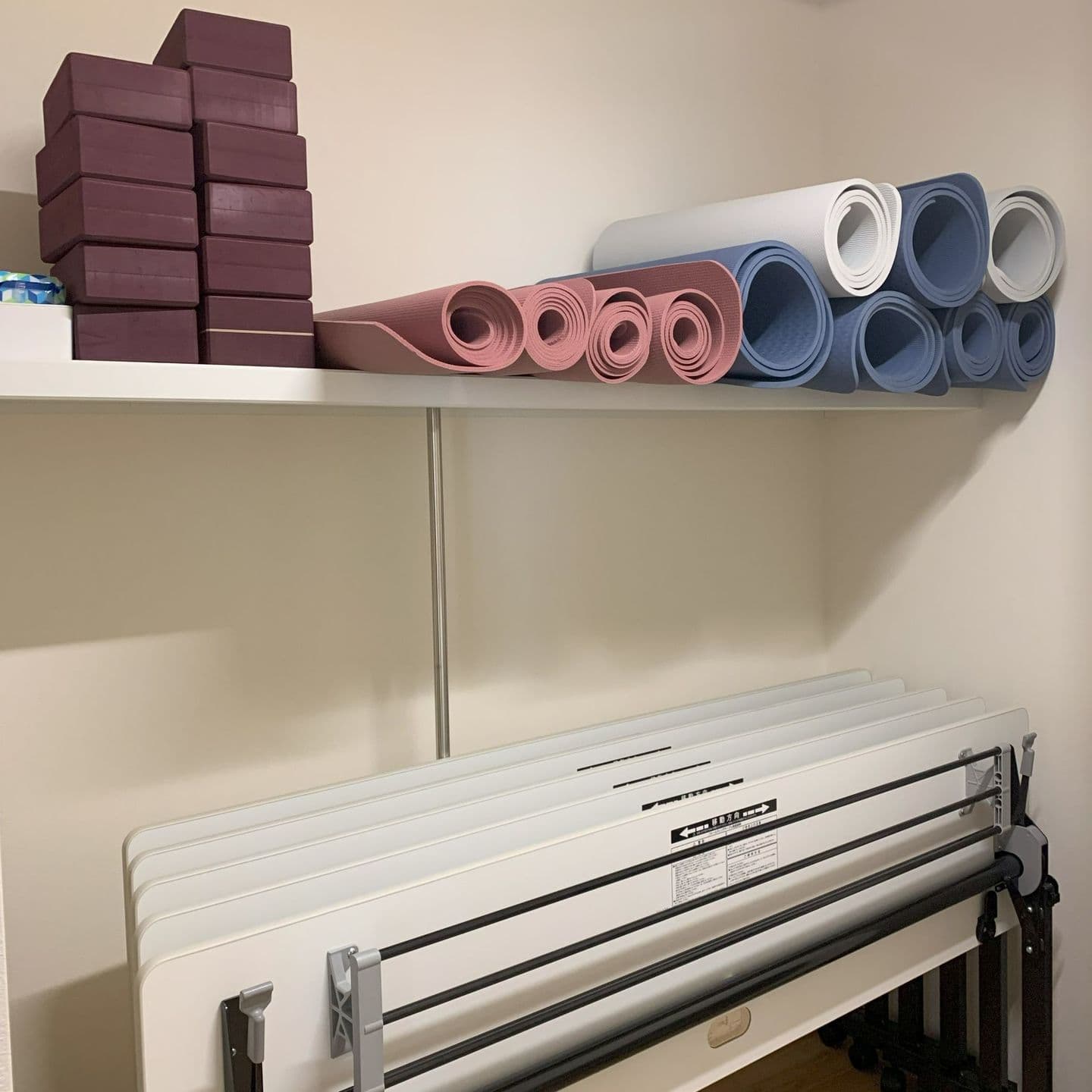大きな収納室には棚を入れヨガマットなどの備品の他、会議机と椅子を収納します。更衣室としてもご利用ください。